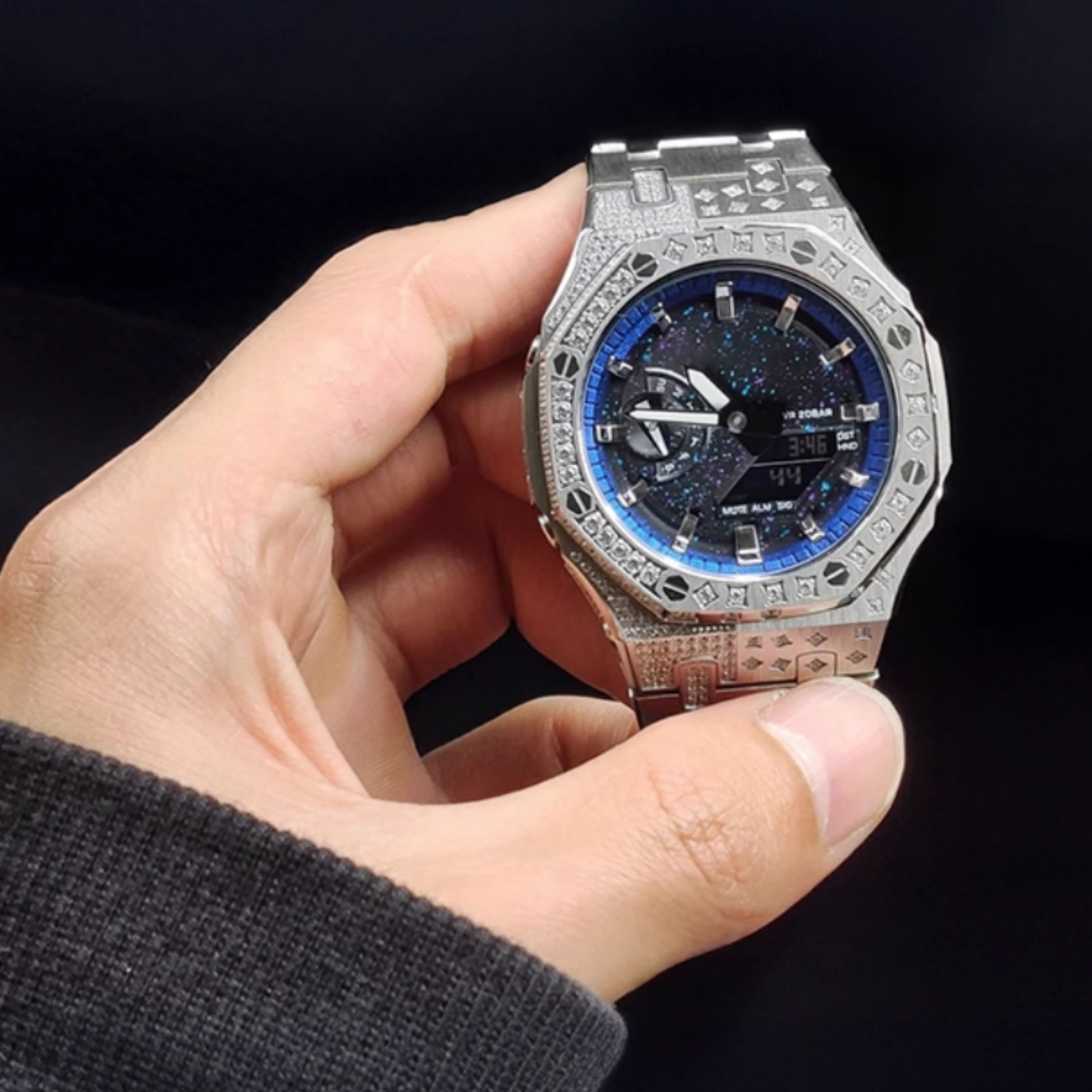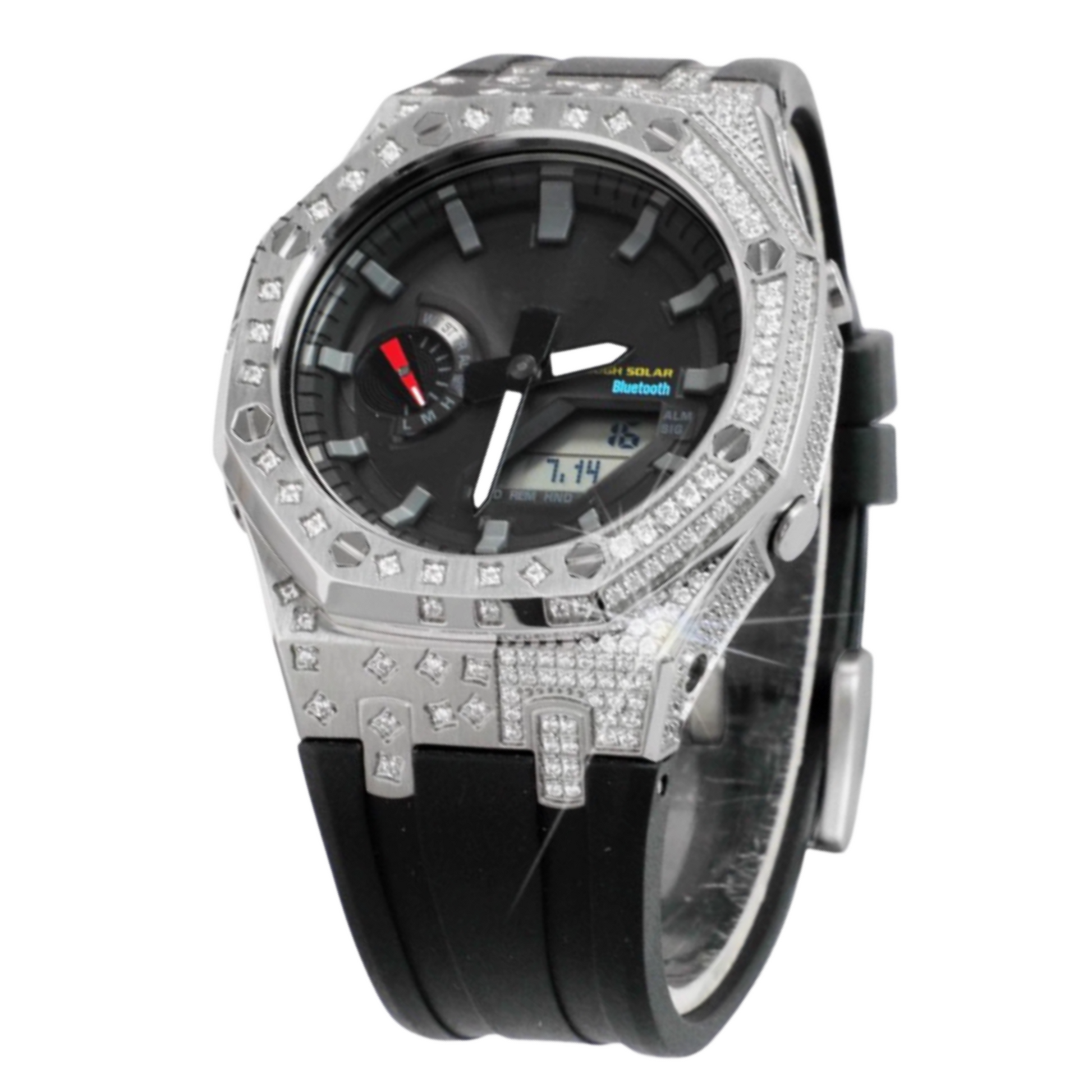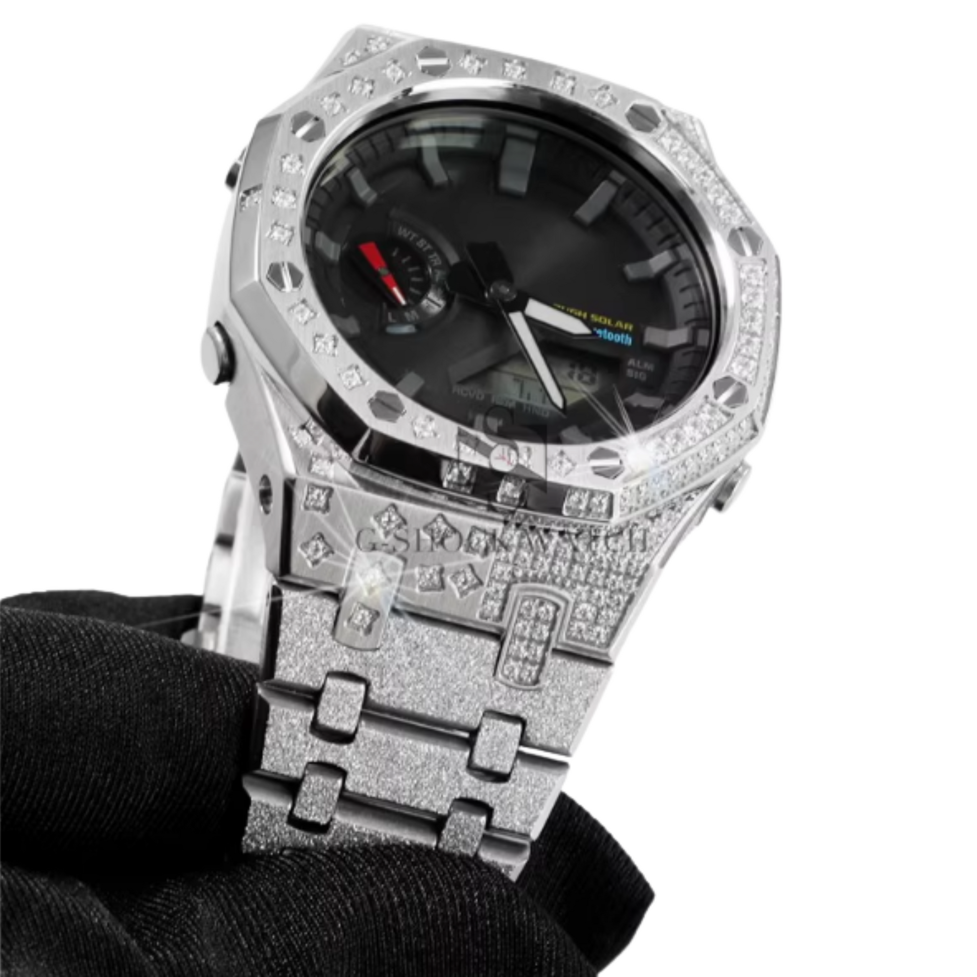 The case is encrusted with diamonds