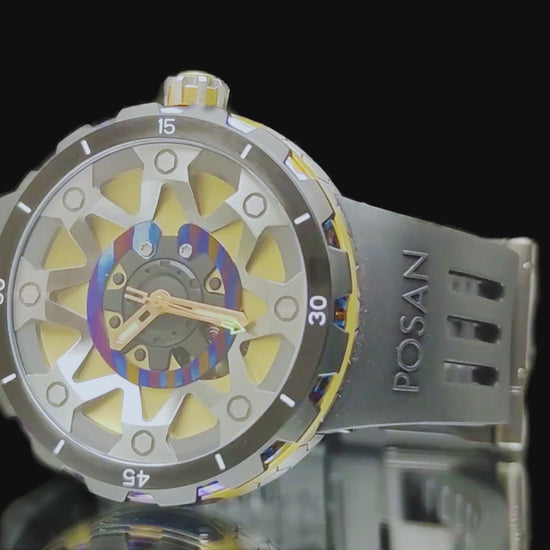 Alliant technicité et design audacieux, la FORGED PSW-001-GBR Black & Gold incarne l’esprit de l’horlogerie contemporaine. Son boîtier en titane associé à une touche artistique de Damascus confère à cette montre une allure robuste et élégante. Le verre saphir anti-reflets offre une clarté irréprochable et une résistance à toute épreuve, tandis que le bracelet en caoutchouc fluoré garantit confort et durabilité, même dans les conditions extrêmes.