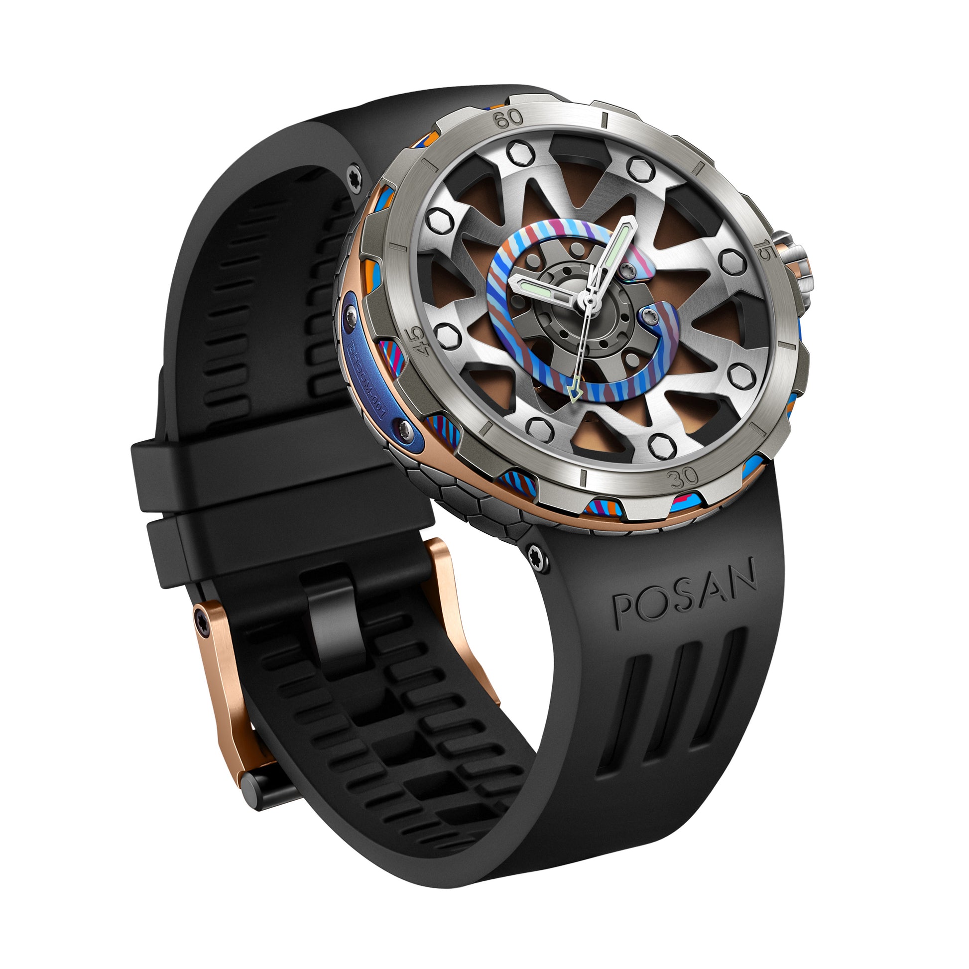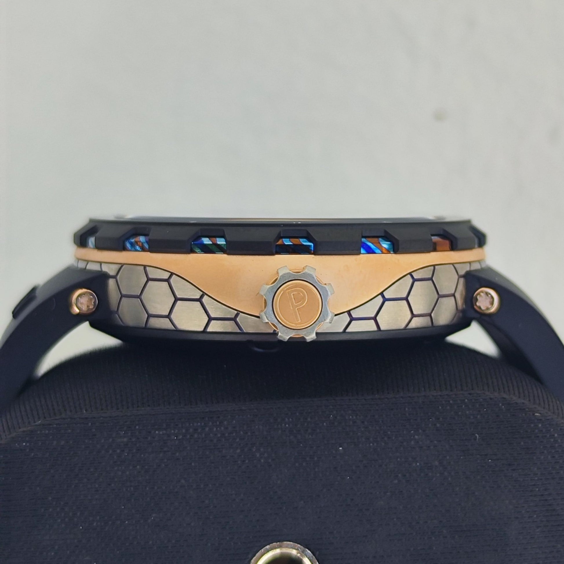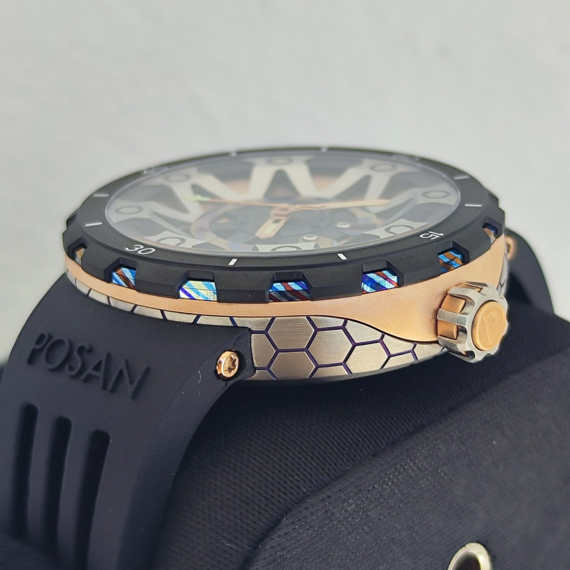 Alliant technicité et design audacieux, la FORGED PSW-001-GBX Black & Rose Gold incarne l’esprit de l’horlogerie contemporaine. Son boîtier en titane associé à une touche artistique de Damascus confère à cette montre une allure robuste et élégante. Le verre saphir anti-reflets offre une clarté irréprochable et une résistance à toute épreuve, tandis que le bracelet en caoutchouc fluoré garantit confort et durabilité, même dans les conditions extrêmes.