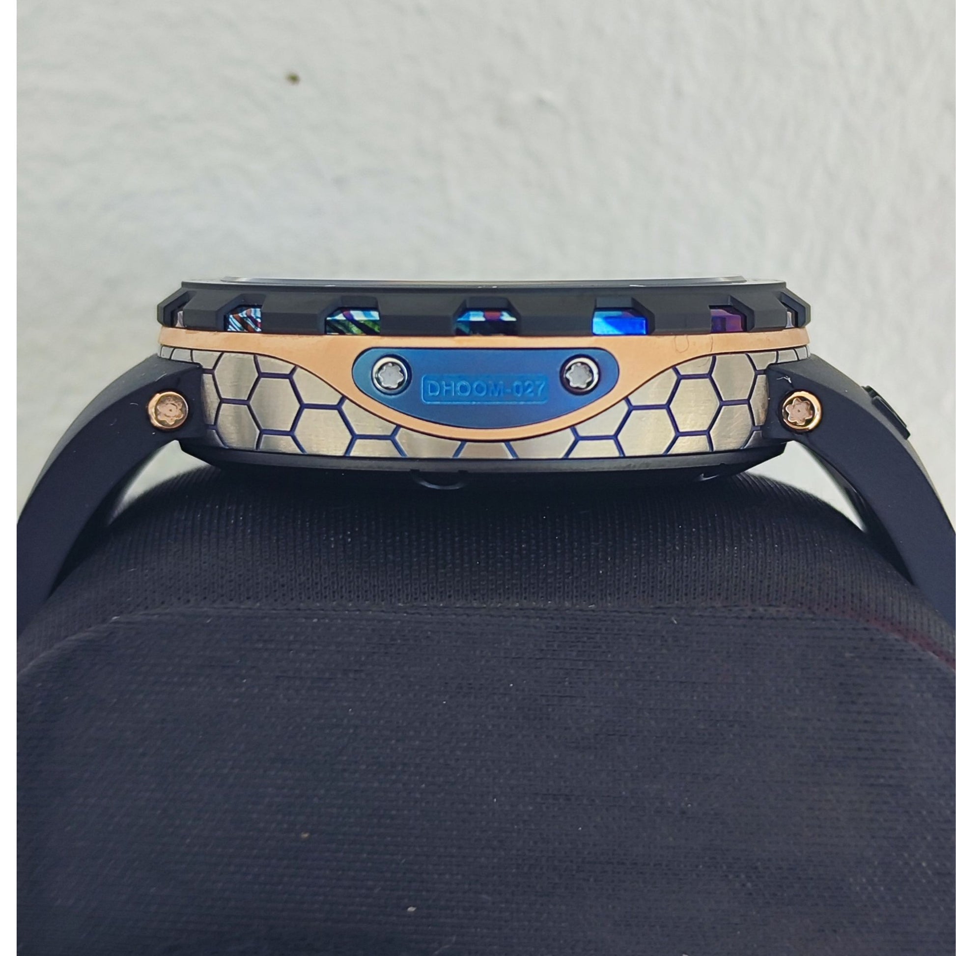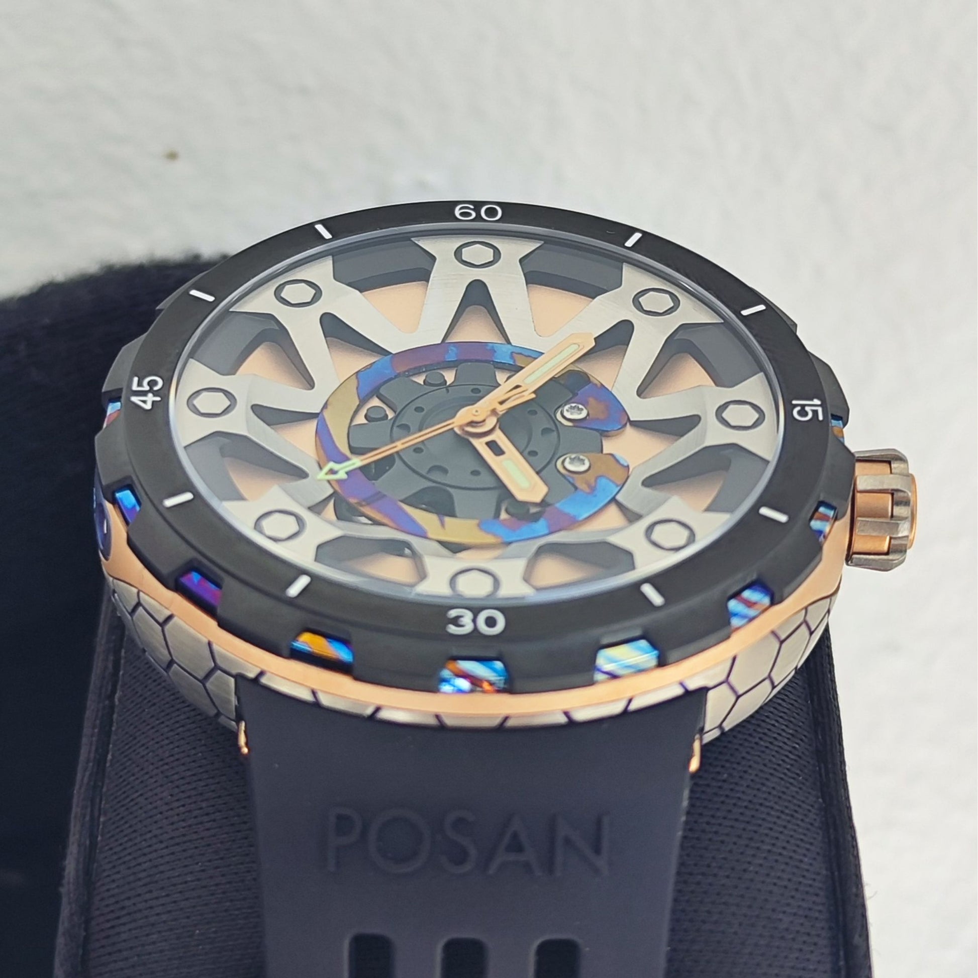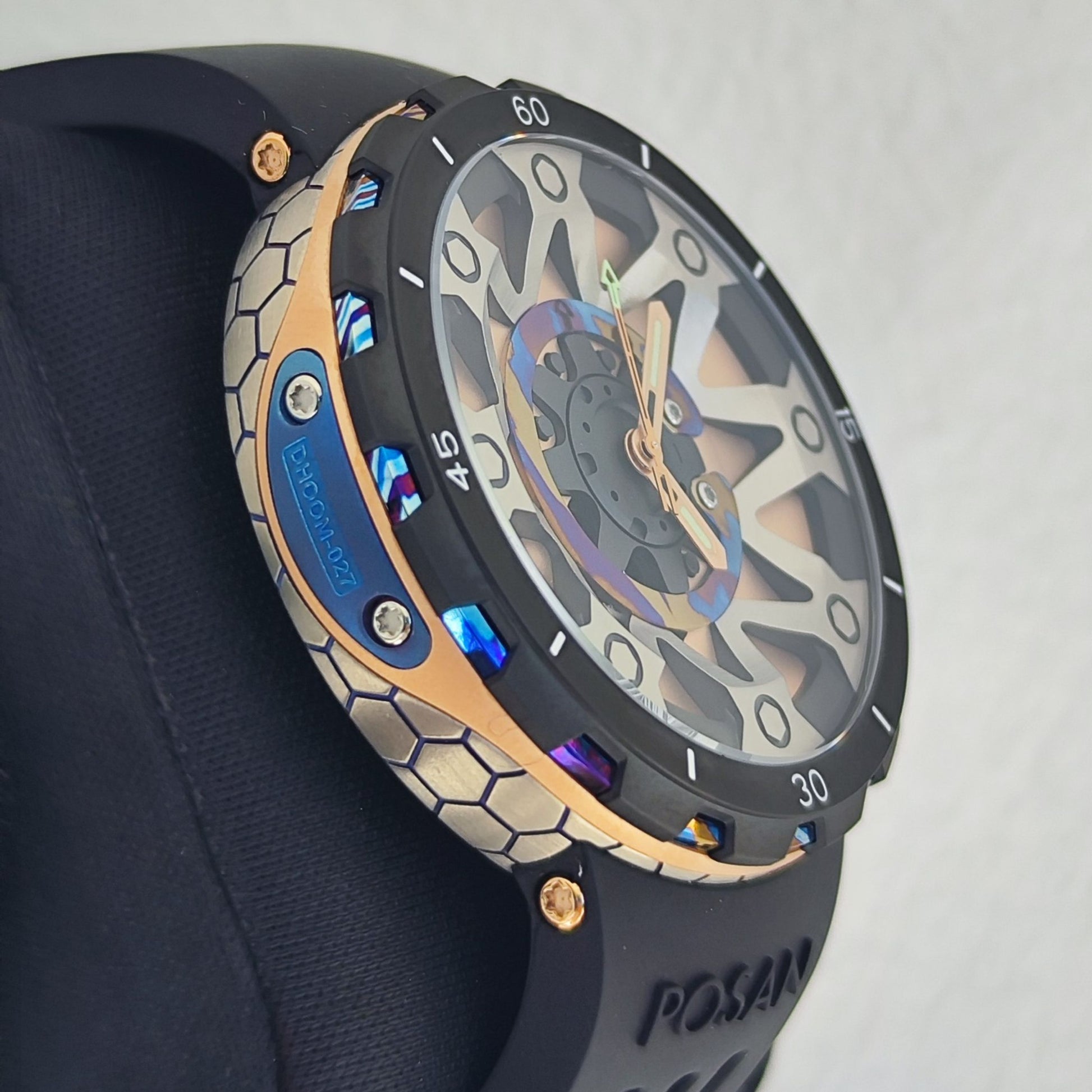 Alliant technicité et design audacieux, la FORGED PSW-001-GBX Black & Rose Gold incarne l’esprit de l’horlogerie contemporaine. Son boîtier en titane associé à une touche artistique de Damascus confère à cette montre une allure robuste et élégante. Le verre saphir anti-reflets offre une clarté irréprochable et une résistance à toute épreuve, tandis que le bracelet en caoutchouc fluoré garantit confort et durabilité, même dans les conditions extrêmes.