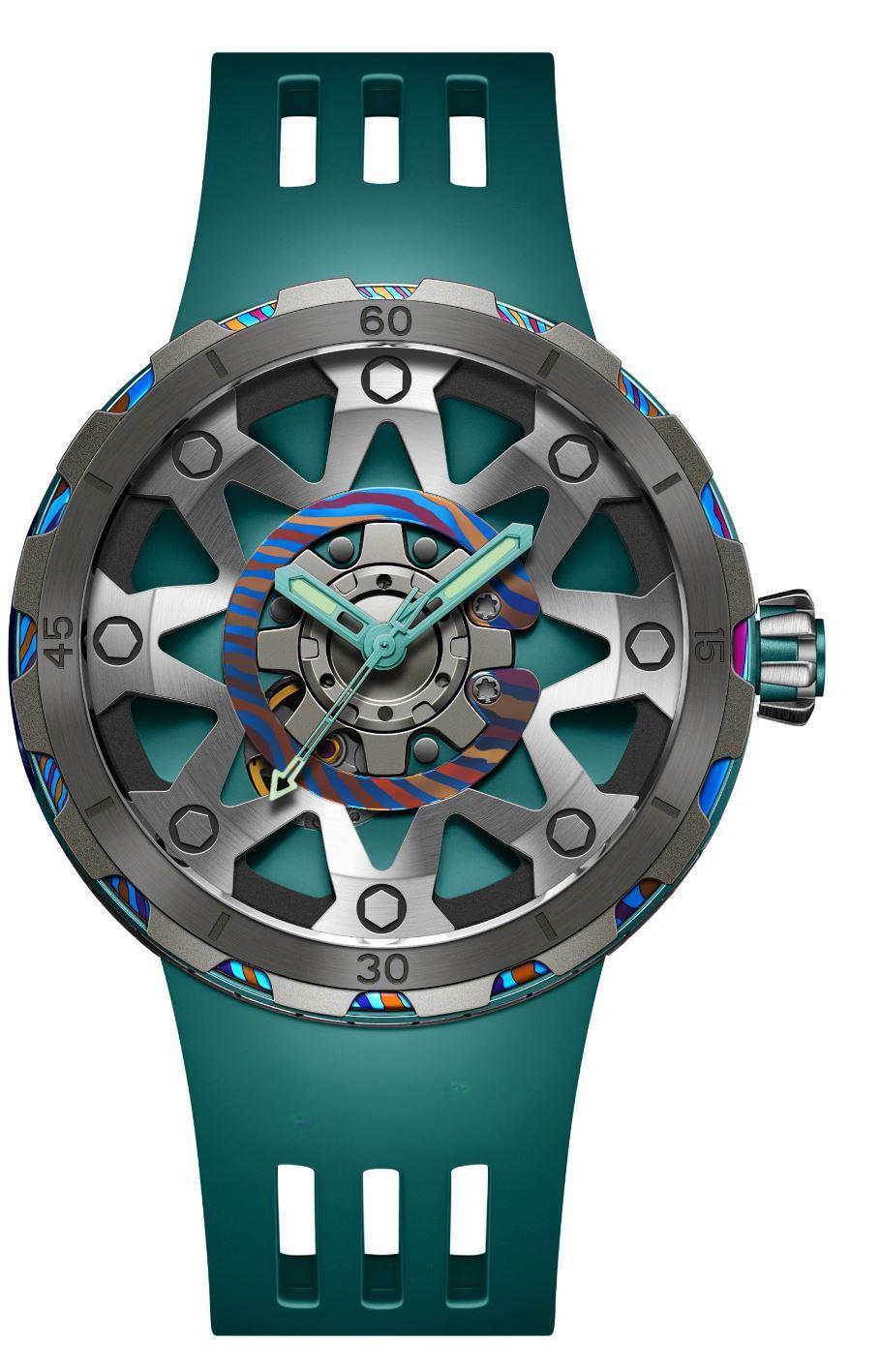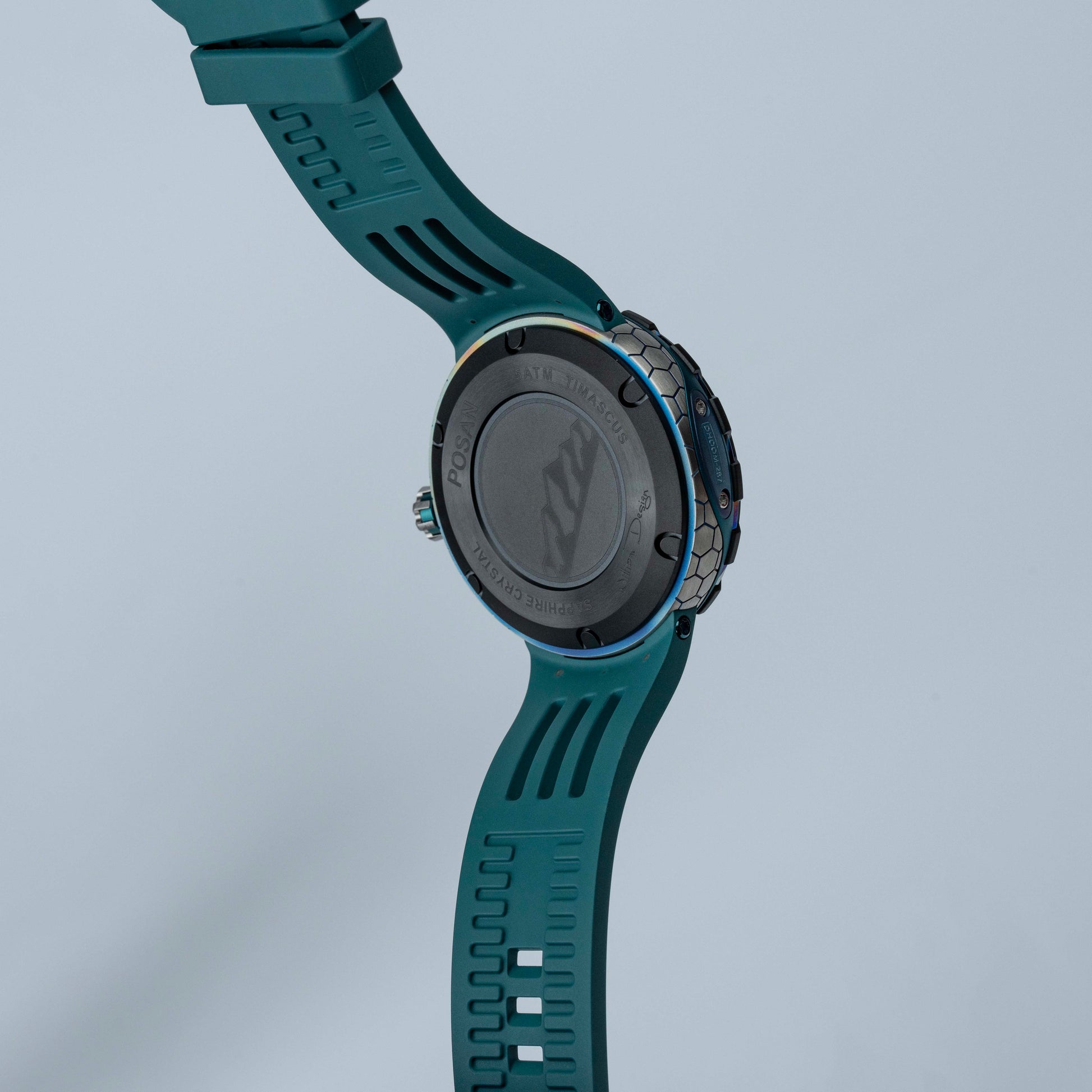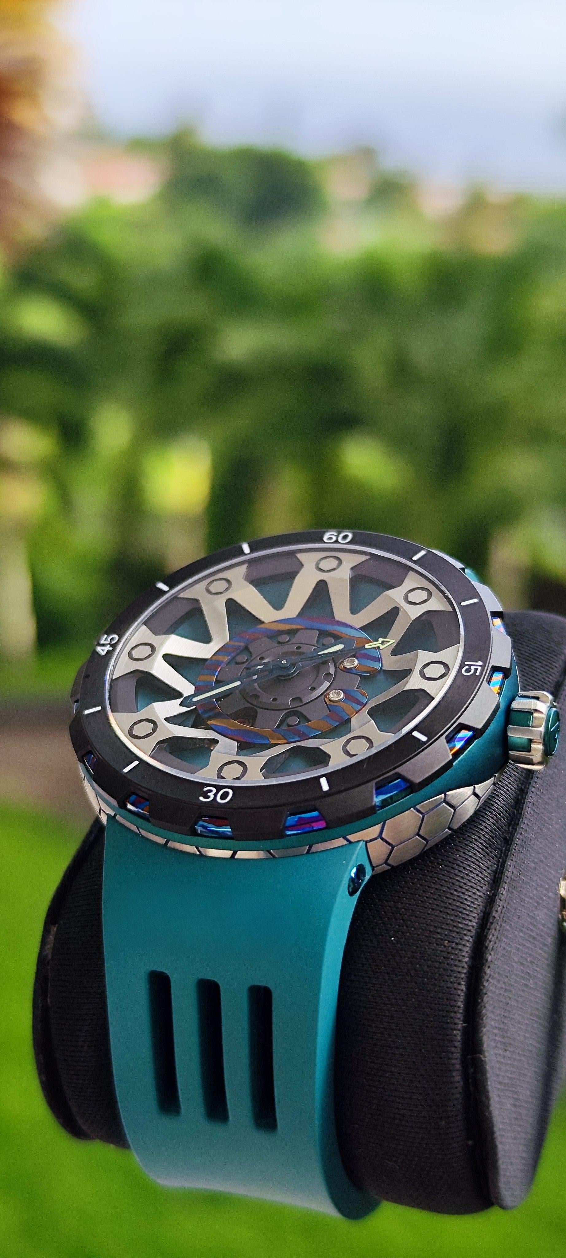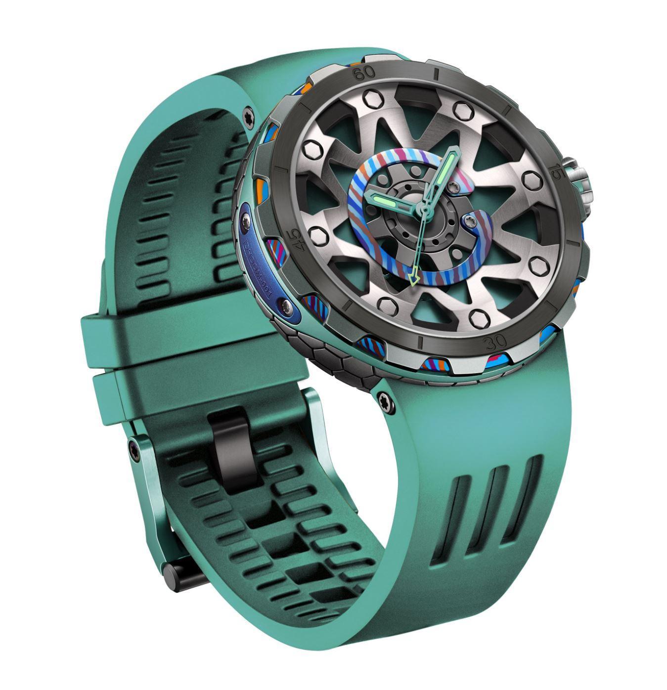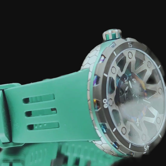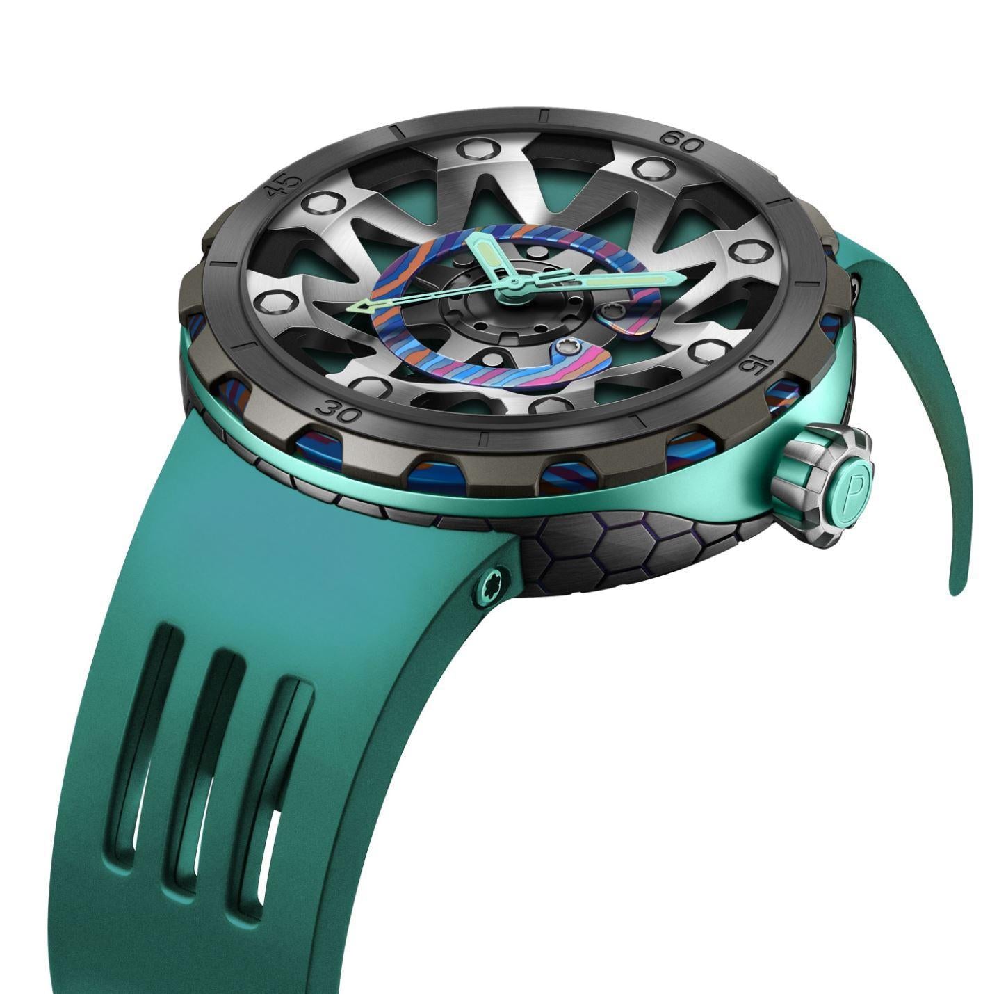 Alliant technicité et design audacieux, la FORGED PSW-001-GAG Green & Silver incarne l’esprit de l’horlogerie contemporaine. Son boîtier en titane associé à une touche artistique de Damascus confère à cette montre une allure robuste et élégante. Le verre saphir anti-reflets offre une clarté irréprochable et une résistance à toute épreuve, tandis que le bracelet en caoutchouc fluoré garantit confort et durabilité, même dans les conditions extrêmes.