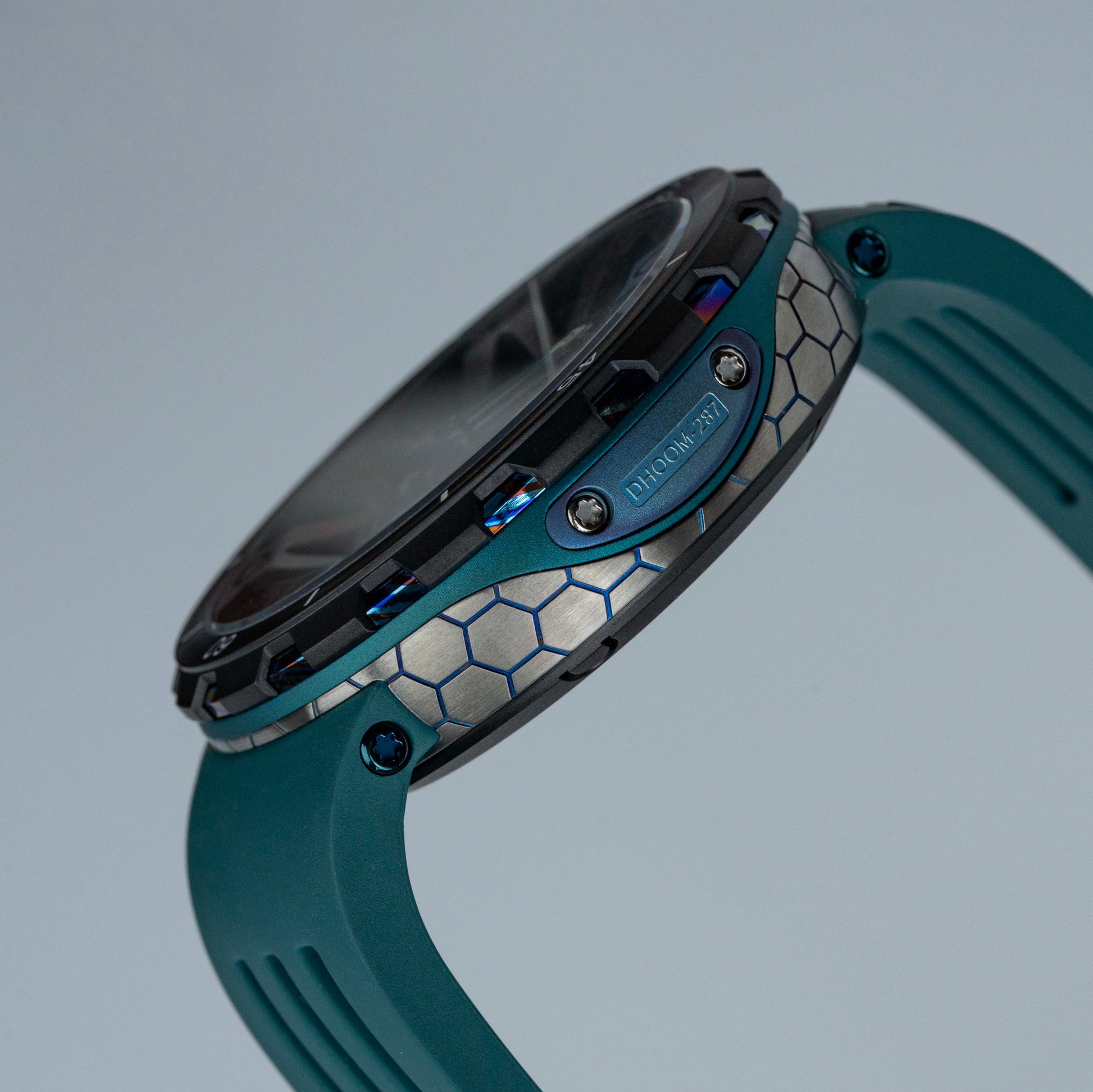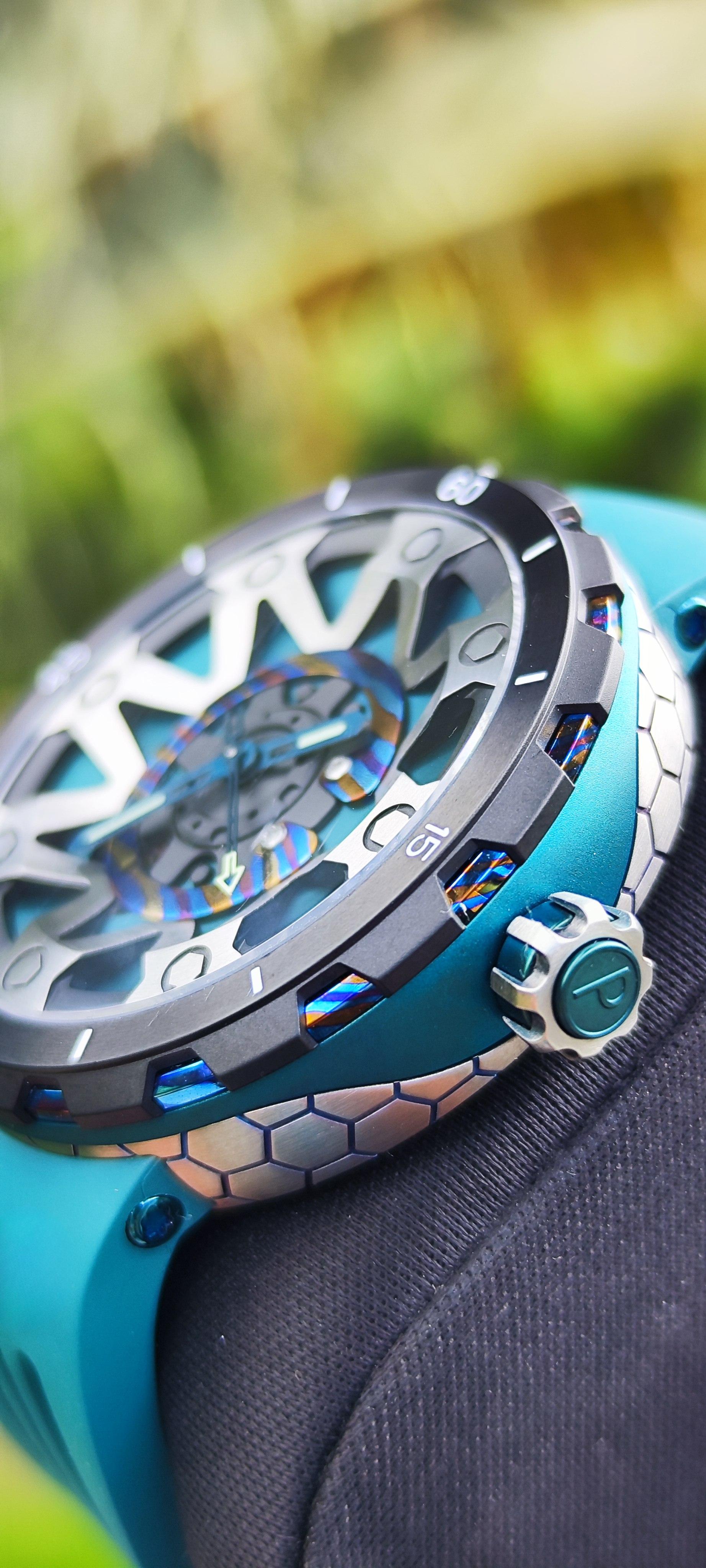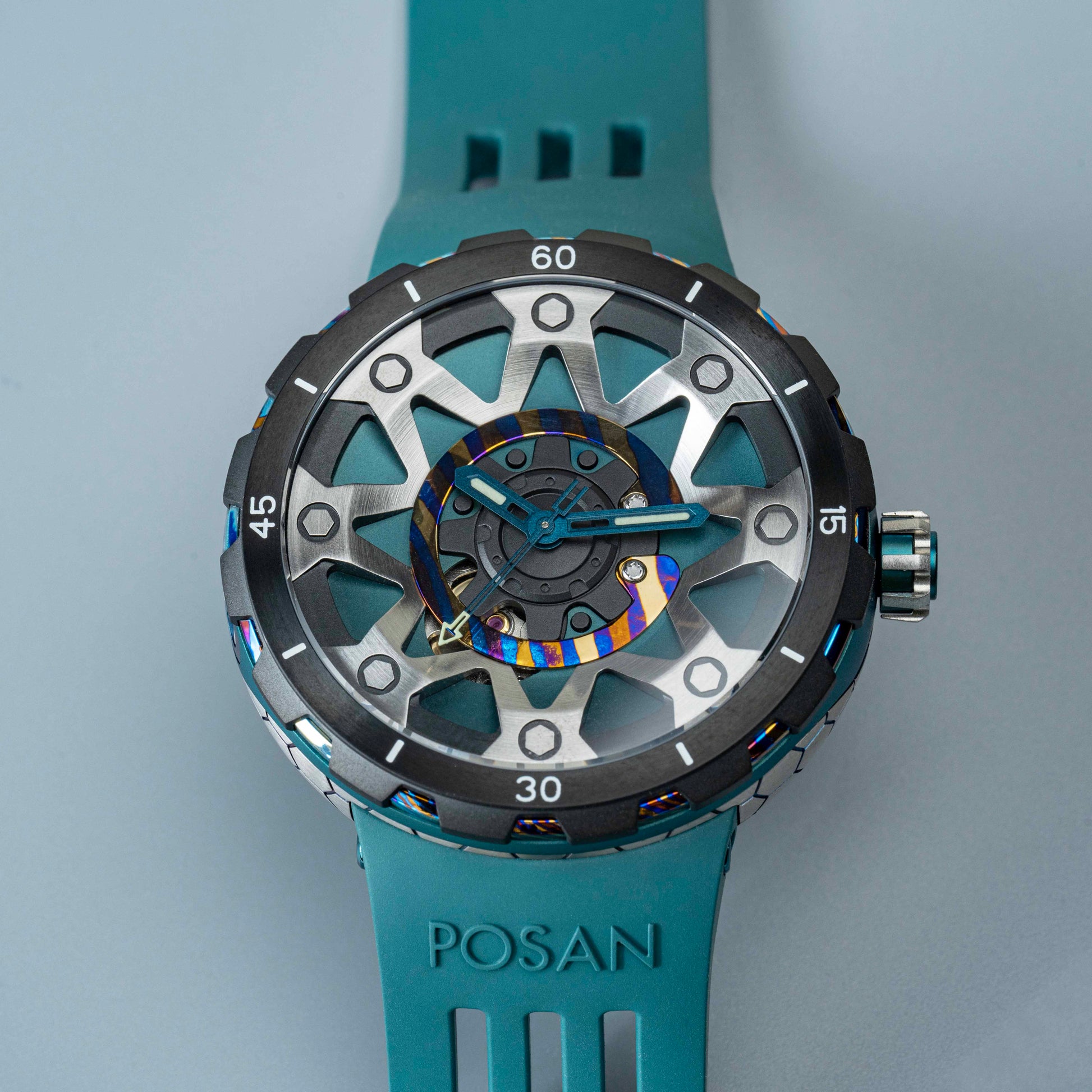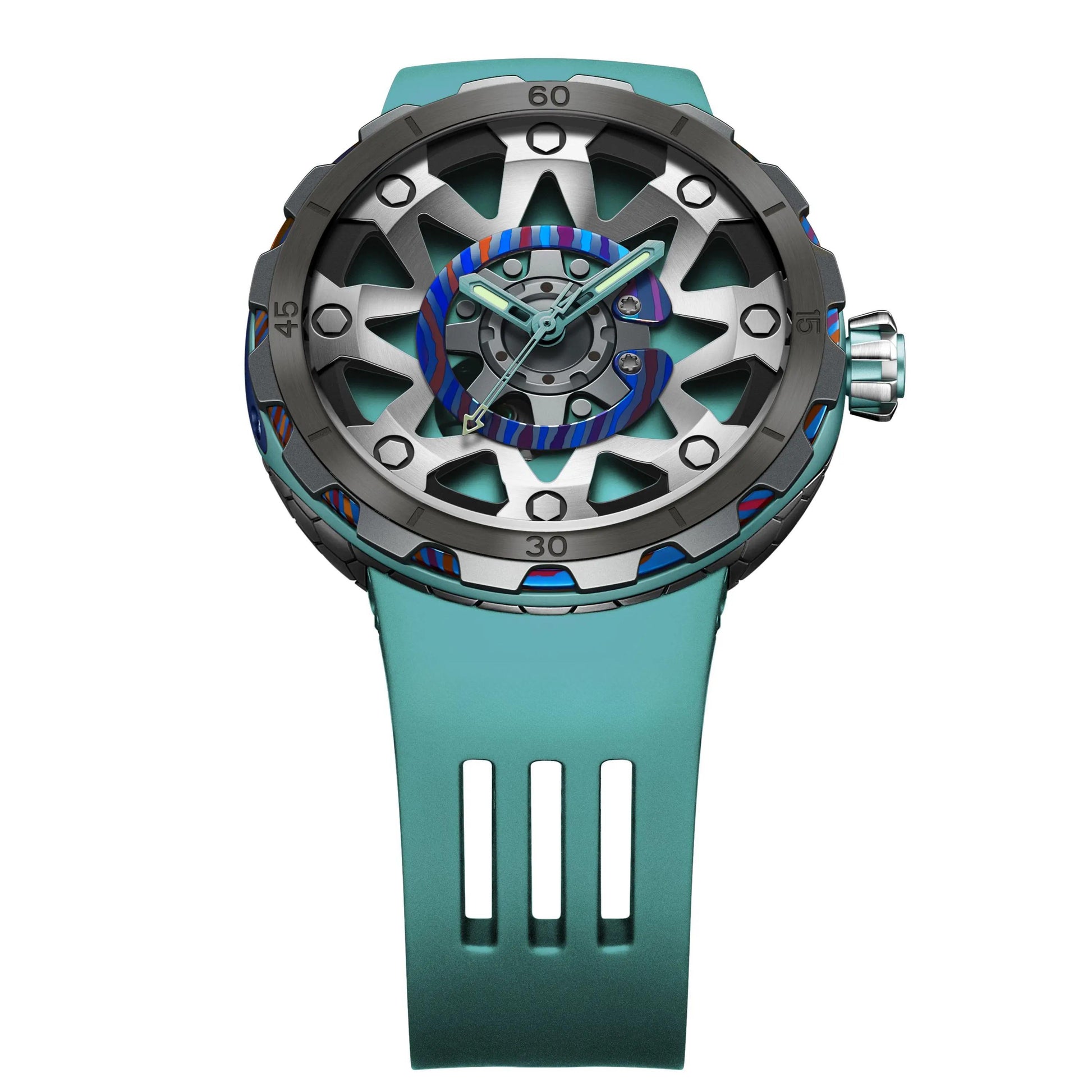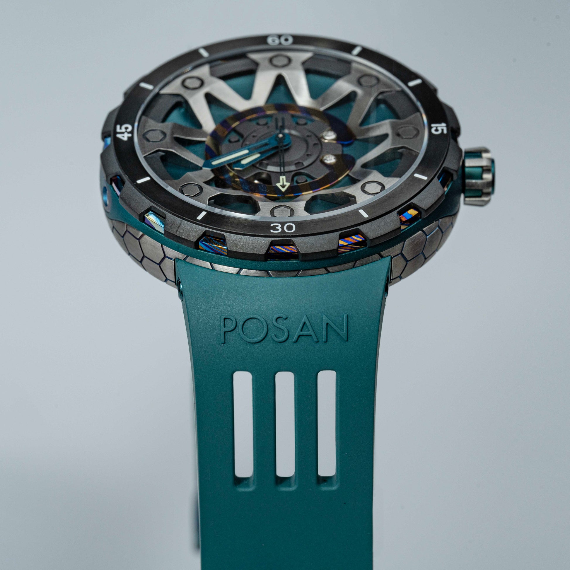 Alliant technicité et design audacieux, la FORGED PSW-001-GAG Green & Silver incarne l’esprit de l’horlogerie contemporaine. Son boîtier en titane associé à une touche artistique de Damascus confère à cette montre une allure robuste et élégante. Le verre saphir anti-reflets offre une clarté irréprochable et une résistance à toute épreuve, tandis que le bracelet en caoutchouc fluoré garantit confort et durabilité, même dans les conditions extrêmes.