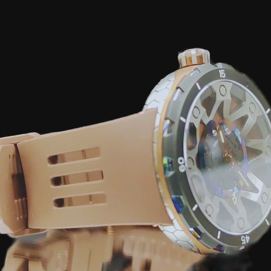 Alliant technicité et design audacieux, la FORGED PSW-001-GCC Coffee & Silver incarne l’esprit de l’horlogerie contemporaine. Son boîtier en titane associé à une touche artistique de Damascus confère à cette montre une allure robuste et élégante. Le verre saphir anti-reflets offre une clarté irréprochable et une résistance à toute épreuve, tandis que le bracelet en caoutchouc fluoré garantit confort et durabilité, même dans les conditions extrêmes.